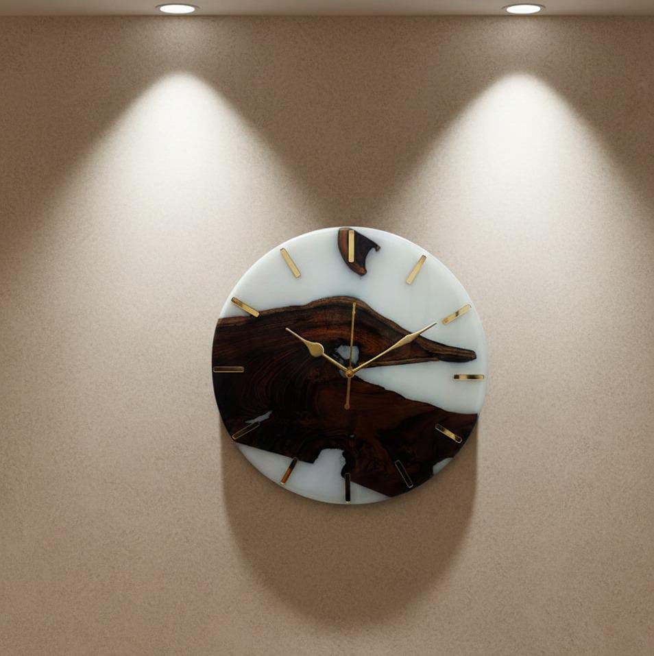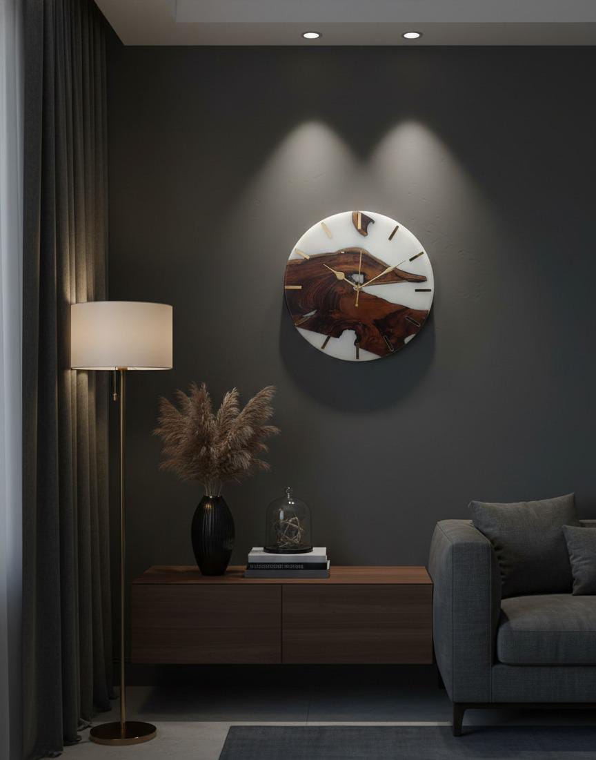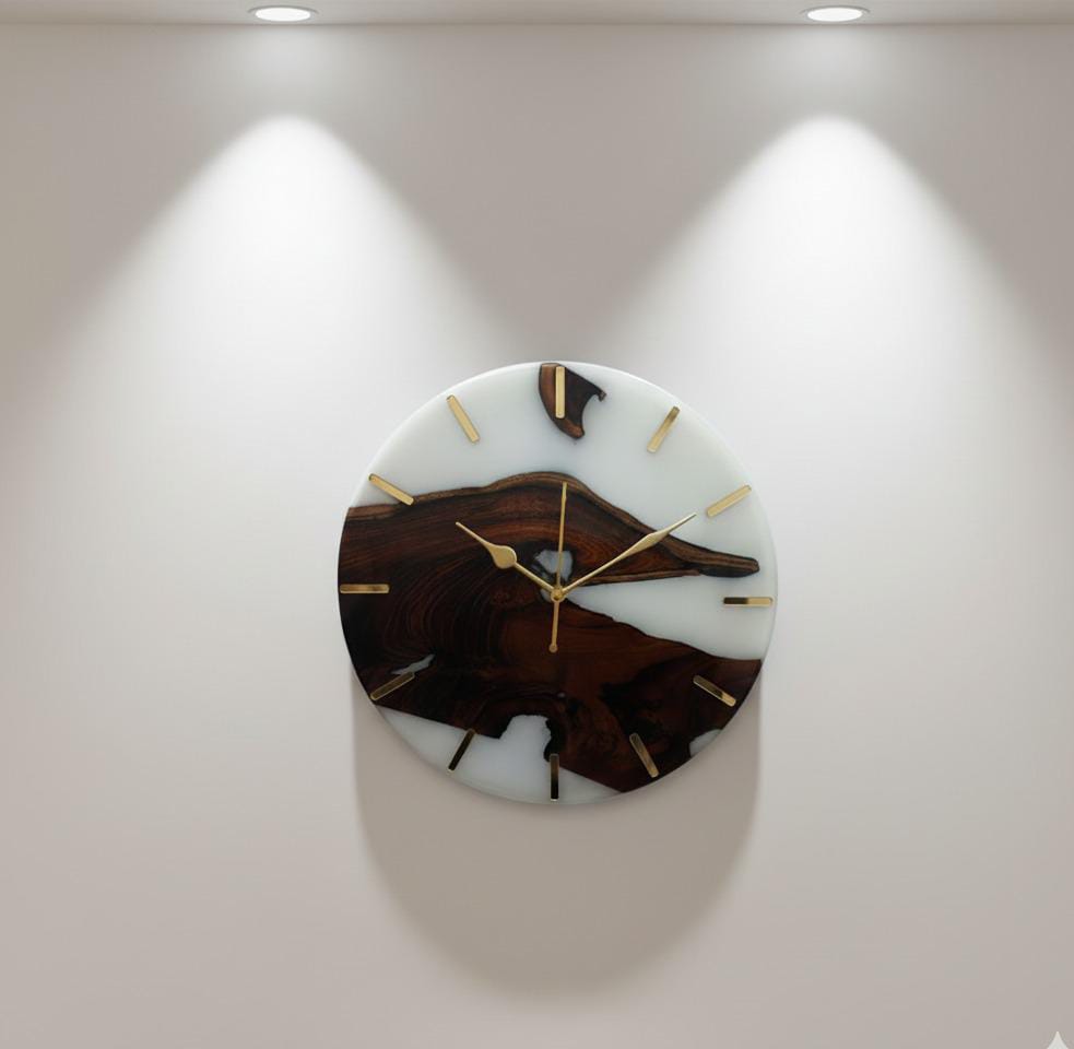 This live-edge teak wood & clear epoxy resin wall clock showcases natural wood grains combined with premium epoxy resin. Designed for modern and classic interiors, this handcrafted wall clock adds warmth, elegance and artistic charm to any space.