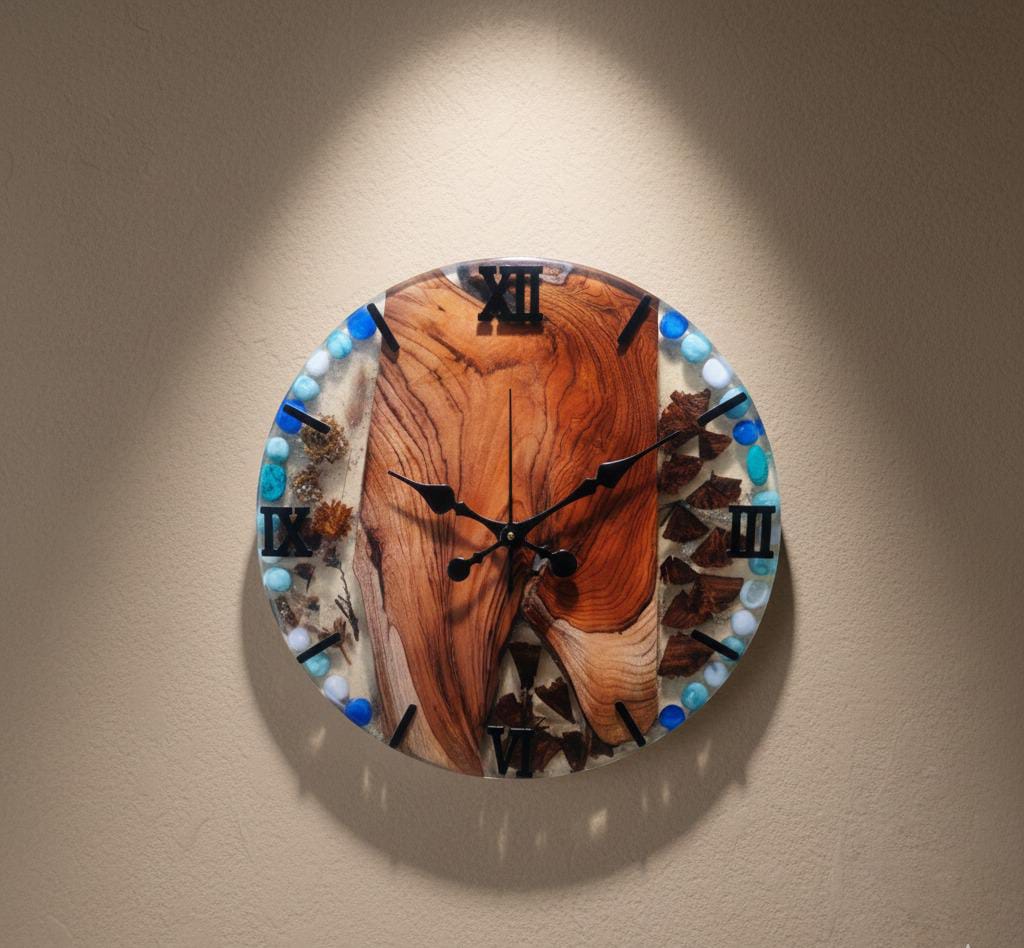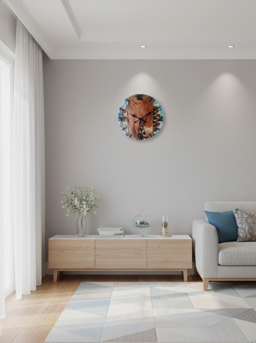 This round teak wood & smoky epoxy resin wall clock blends minimalism with artistic elegance. Designed for modern interiors, it delivers a calm yet premium look with silent quartz movement.